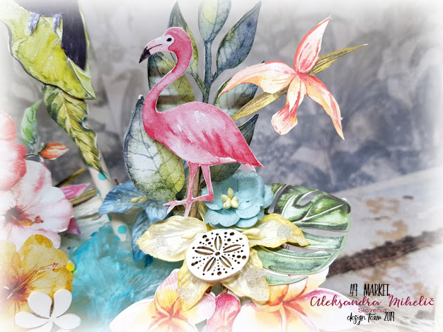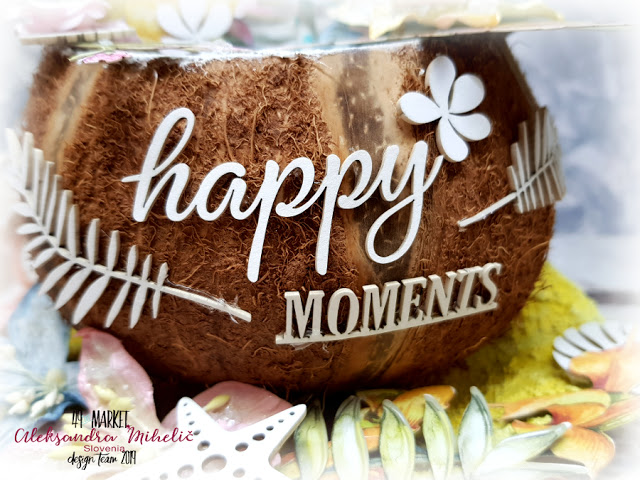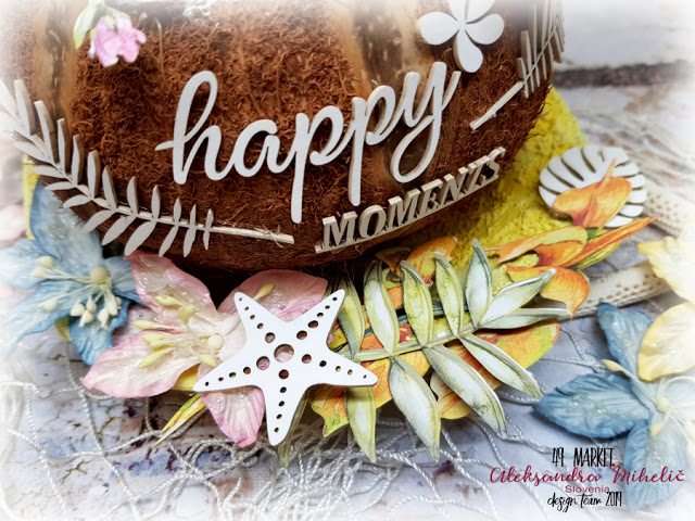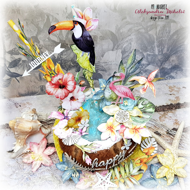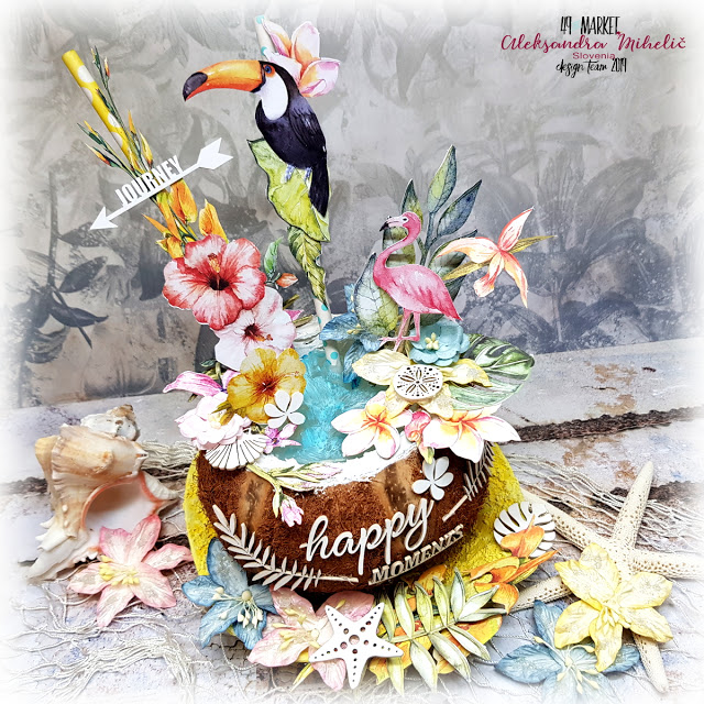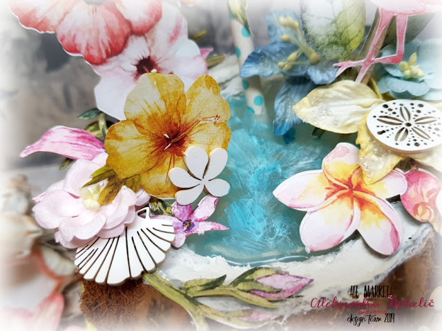 I took an empty coconut shell and an used dessert plate. Using some mixed media techniques I altered and colored the plate and created inside for my coconut shell, so that it looks like a fresh coconut with coconut meat at the sides and with coctail drink in the middle. I then used gorgeous 49 and Market “Tropical Paradise” Laser Cut Sheet along with its Bonus sheet to get some gorgeous tropical images with which I embellished my Coctail drink. I also added some gorgeous 49 and Market flowers and some beautiful sea-themed chipboards.
